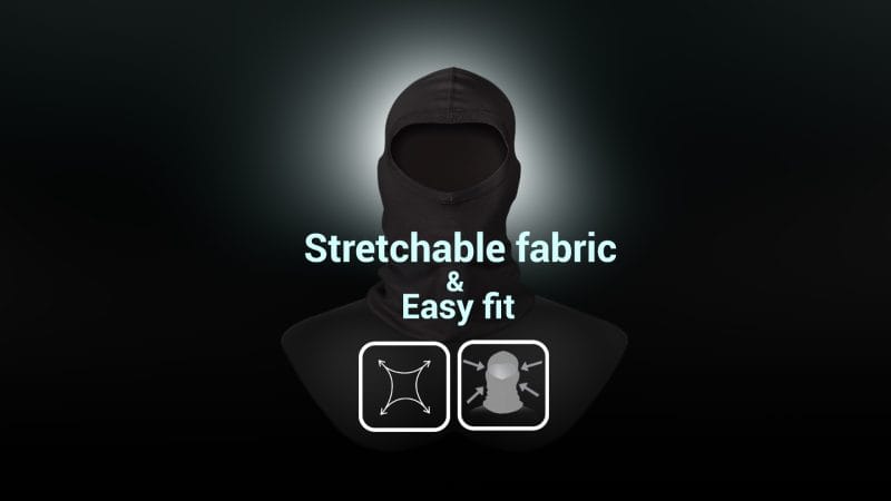 The STUDDS Balaclava features stretchable fabric that adapts easily to different face shapes, ensuring a snug, comfortable fit without feeling tight or restrictive.