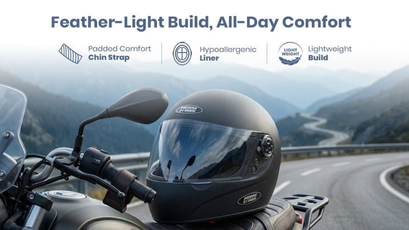 Feather Light Build, All-Day Comfort STUDDS’ Chrome Deluxe Helmet is designed for riders who prioritize comfort throughout the day, combining lightweight construction with soft, skin-friendly interior elements. · Padded comfort chin strap – offers a secure yet cushioned fit that prevents pressure and discomfort during long riding hours. · Hypoallergenic liner – helps reduce skin irritation while maintaining a fresh and comfortable interior feel. · Lightweight build – minimizes neck strain, making daily commutes and extended rides easier and more comfortable. | ![]() |