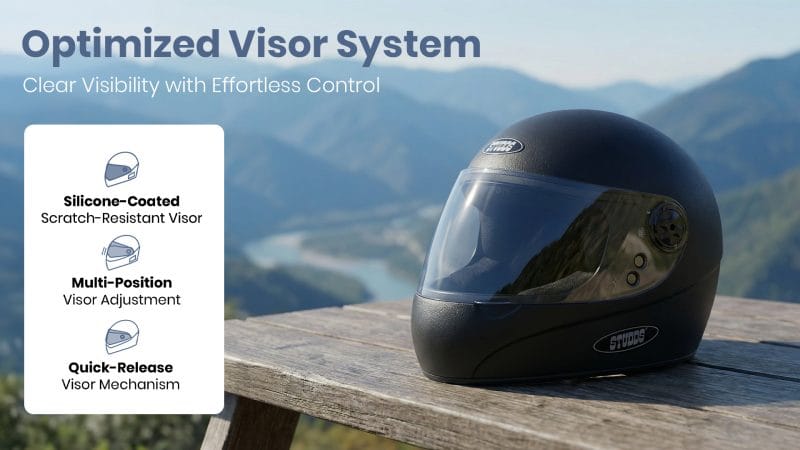 ![]() | Smooth Vision & Easy Visor Operation STUDDS’ Chrome Deluxe Helmet enhances riding convenience with a durable visor system designed for clarity, flexibility, and quick handling. · Silicon-coated scratch-resistant visor – improves durability and helps maintain clear, distortion-free vision over prolonged use. · Multi-position visor adjustment – allows riders to set the visor at different levels for better airflow and visibility control. · Quick-release visor mechanism – enables fast and effortless visor removal or replacement whenever required. |