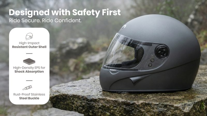 Strong Protection with Secure Fastening. Built with safety as a priority, the Chrome Super combines robust materials and reliable locking for dependable rider protection. · High impact-resistant outer shell – offers a tough protective barrier against external shocks and road impacts. · High-density EPS – absorbs and distributes impact energy efficiently to minimize force transferred to the head. · Rustproof stainless-steel buckle – ensures strong, corrosion-resistant fastening for long-term durability and safety. | ![]() |