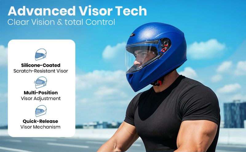 · Multi-position visor adjustment – lets riders set the visor at different levels for better airflow and visibility control.