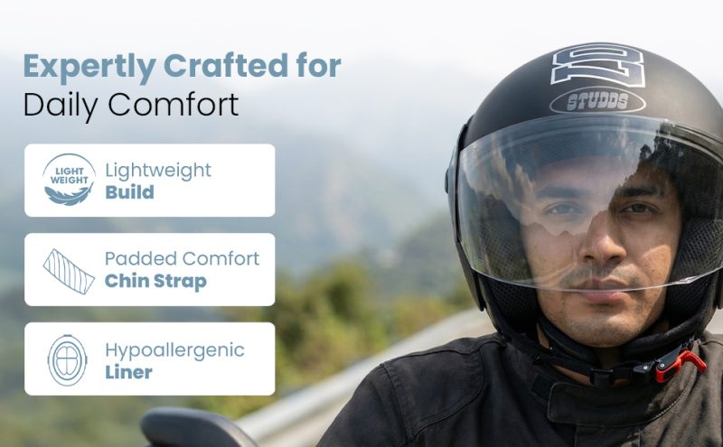 ![]() | Lightweight Comfort for Everyday Rides The STUDDS Cub Unicolor is designed to keep daily rides comfortable with a light structure and soft interior elements that support long-lasting ease. · Lightweight build – reduces pressure on the neck and head, making the helmet comfortable for everyday commuting and extended riding hours. · Padded comfort chin strap – provides a secure yet cushioned fit that prevents discomfort and rubbing under the chin. · Hypoallergenic liner – helps protect sensitive skin while keeping the helmet interior fresh and irritation-free. |