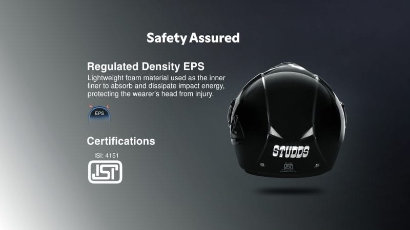 Certified Protection with Controlled Impact Safety STUDDS Downtown Open Face Helmet is engineered to provide reliable protection for everyday city riding, combining controlled impact absorption with certified safety standards. · Regulated density EPS – absorbs and distributes impact energy efficiently to reduce force transferred to the rider’s head during sudden impacts. · ISI certified – ensures the helmet meets required safety and quality standards for dependable daily use. | ![]() |