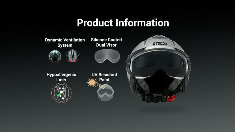 ![]() | Comfort, Visibility & Everyday Durability STUDDS Downtown D3 is designed for urban riders who value airflow, clear vision, and long-lasting comfort in everyday riding conditions. · Dynamic ventilation system – promotes continuous airflow to reduce heat buildup and keep the interior comfortable during city rides. · Silicon-coated dual visor – enhances durability and visual clarity while allowing smooth adaptation to bright and low-light conditions. · Hypoallergenic liner – helps prevent skin irritation and maintains a fresh, comfortable feel even during extended use. · UV-resistant paint – protects the helmet’s finish from fading, keeping it looking newer despite regular sun exposure. |