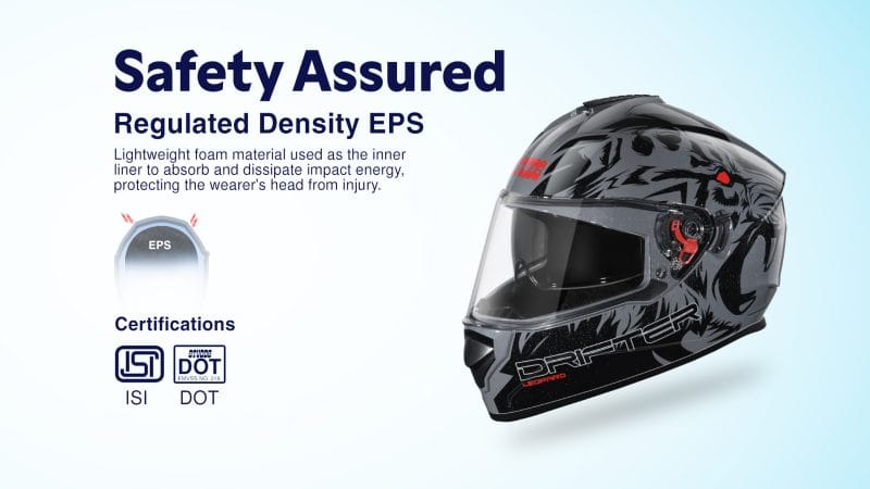 Certified Impact Protection The Drifter D2 Leopard Decor Full Face Helmet is engineered to deliver reliable protection through controlled impact absorption and globally recognized safety certifications. · Regulated density EPS – absorbs and disperses impact energy efficiently to reduce force transferred to the rider’s head during sudden impacts. · ISI and DOT certified – ensures compliance with national and international safety standards for trusted protection. | ![]() |