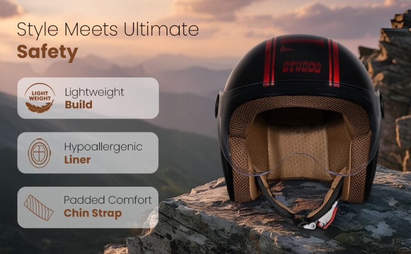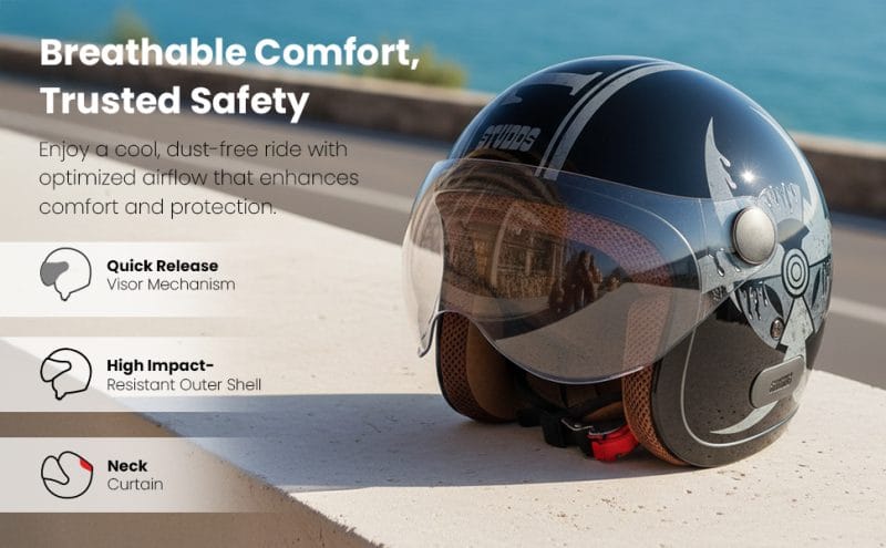 If you love the feeling of open roads and open helmets, the Studds JET Open Face Helmet is made for you. With its classic JET-style design and short chopper visor, this helmet adds a cool, retro touch to your everyday rides while keeping safety and comfort in focus. Lightweight and easy to wear, it is perfect for city commuting, short spins, and relaxed cruising.
