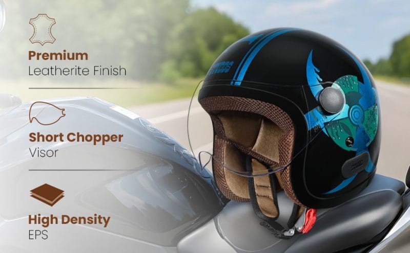 Premium Leatherette Fabric: Premium leatherette fabric adds a refined look and a soft touch feel inside the helmet. It enhances comfort and style while maintaining long-lasting durability. Short Chopper Visor: The short chopper visor offers clear visibility while protecting the eyes from wind and dust. It maintains the helmet’s classic open face look with practical everyday utility. High Density EPS: High-density EPS padding provides enhanced shock absorption for improved rider safety. It cushions the head effectively during impacts without adding extra weight. | ![]() |