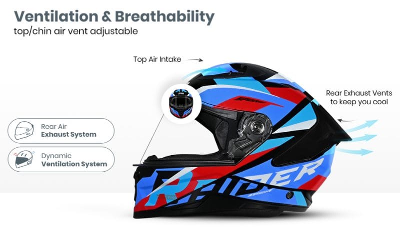 Provides rider with fresh air while riding, aiding rider comfort. Helps in directing hot air within the helmet outwards for rider comfort during extended usage.