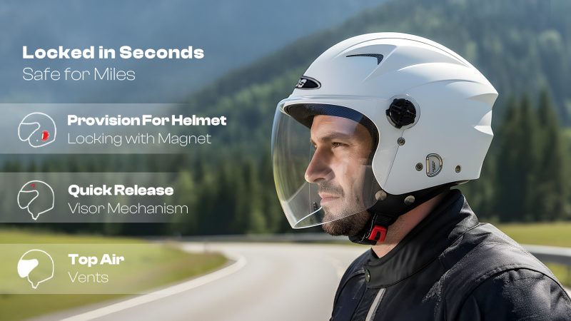 Secure Convenience in Seconds Built for rider convenience, the Vogue Eco Helmet combines smart locking, ventilation, and easy visor operation for hassle-free commuting. · Helmet locking provision with magnet – enables quick, secure helmet locking when parked. · Quick-release visor mechanism – allows smooth and effortless visor removal or replacement when needed. · Top air vent – improves airflow inside the helmet to enhance comfort during warm or extended rides. | ![]() |